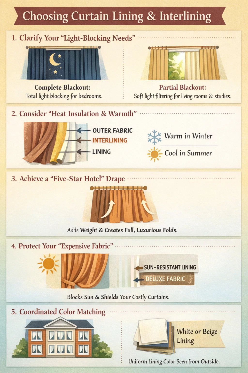 A függöny bélés kiválasztása és közbélés olyan, mintha „fehérneműbe” és „felsőruházatba” öltöztetné a függönyét. A külső anyag határozza meg a függönyök szépségét, míg ez a két belső réteg határozza meg, hogy mennyire funkcionálisak és jól drapozósak.