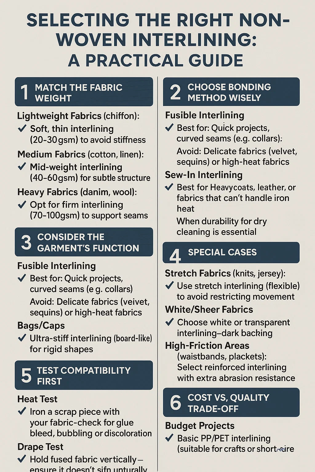 Könnyű szövetek (sifon, selyem): Használjon puha, vékony interlining-t (20-30 gm) a merevség elkerüléséhez.